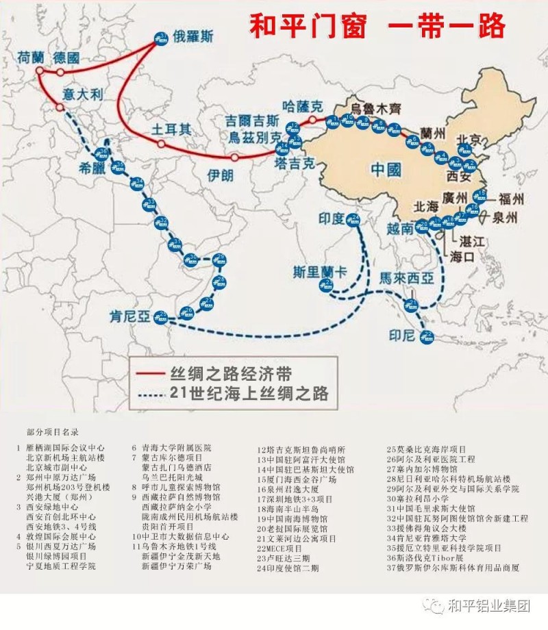 “一带一路”战略构想的提出,融通古今、连接中外,为沿线国家优势互补、开放发展开启了新的机遇之窗,门窗丝路是现代“中国制造”赋予“一带一路”建设的时代主题,打造中国门窗幕墙行业的时代名片,也为我国加强与沿线国家合作提供了新的视角。勇于担当的和平铝业立志通过“和平门窗”、“和平幕墙”、“和平铝材”为“匠心智造”积极代言,推动行业发展,与“一带一路”沿线部分地区和国家重点项目进行对外合作,从雁栖湖国际会议中心、西安绿地中心、西安皇城坊、银川西夏万达广场、银川绿博园项目、宁夏地质工程学院到敦煌国际会展中心、敦煌国际酒店、青海大学附属医院、新疆伊宁万荣广场、乌鲁木齐地铁1号线等上百个项目,一路向西与“一带一路”结下了不解之缘……