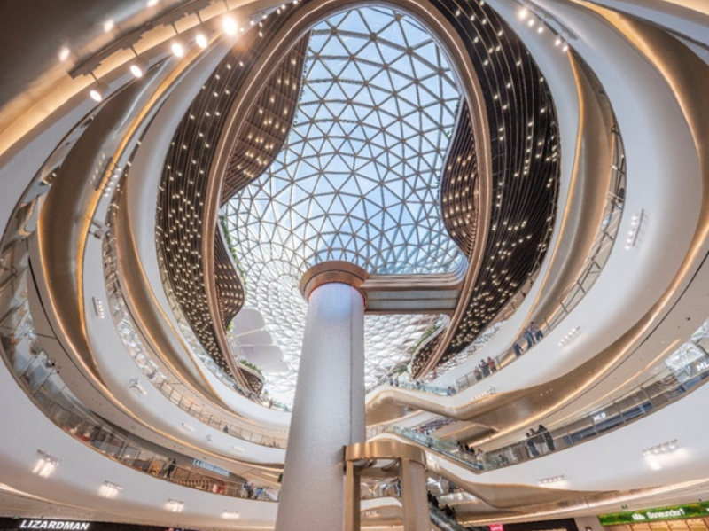 结构美学与空间意向的深度融合。王府井WellTown最大结构单体建筑长度达295m,室内连桥宽度介于24–38m之间。设计以大跨度空间钢结构结合精细化幕墙系统为核心技术,并针对穹顶的排水、防雪及极端工况开展专项设计,完美呈现商业内部艺术化空间,将三座巨型穹顶的优雅美感淋漓展现,达成结构美学与自然灵感的完美统一。