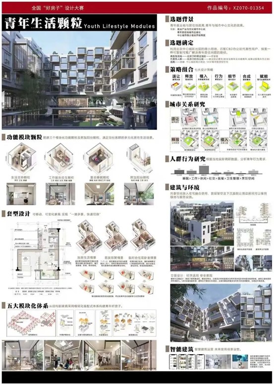 作品利用城市中心城区出现的微小用地,围绕北京CBD新青年真实租房需求,探索一种可复制的新建青年保障性租赁住房设计路径。整合新青年六大居住功能需求聚合成三种模块化功能单元,从结构到家具采用模块化装配式体系实现高灵活度的空间供给。依托智慧运营和科技技术,营造可迭代升级、未来充满无限可能的新青年好房子。
