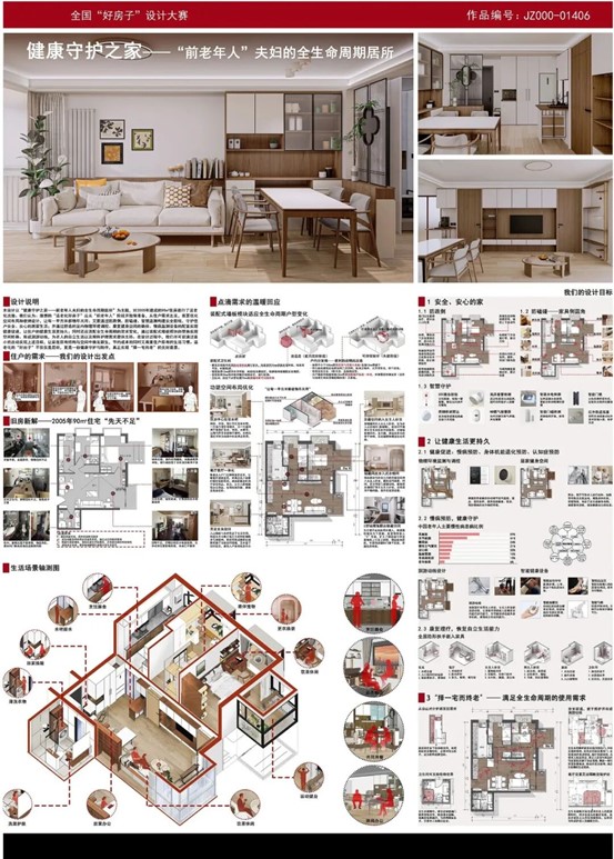 作品依托一套20年房龄、建筑面积90.3平方米的真实住宅案例,以最小改动打造适老化焕新方案。秉持“早规划、早适配”理念,贴合“前老年人”住户需求优化收纳空间,筑牢防跌倒、智慧监测安全防线,搭配舒适环境与慢病监测守护健康,以装配式技术模块、洄游动线实现全生命周期适配,兼顾自理与照料需求。