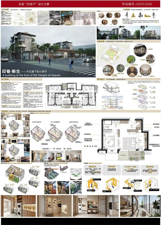 作品立足天坛地域文化,以围合式布局、新中式风格呼应城市风貌。创新“立体叠院”理念,探索产品组合模式,延续老城居民情感记忆。户型公区营造多层级共享空间,户内以LDKBG(客厅、餐厅、厨房、阳台、花园)一体化、空间可变、多场景MAX横厅、极致收纳、全屋智能及四季阳台,打造文化传承、情感共鸣、功能适配、科技赋能的安置房“好房子”。