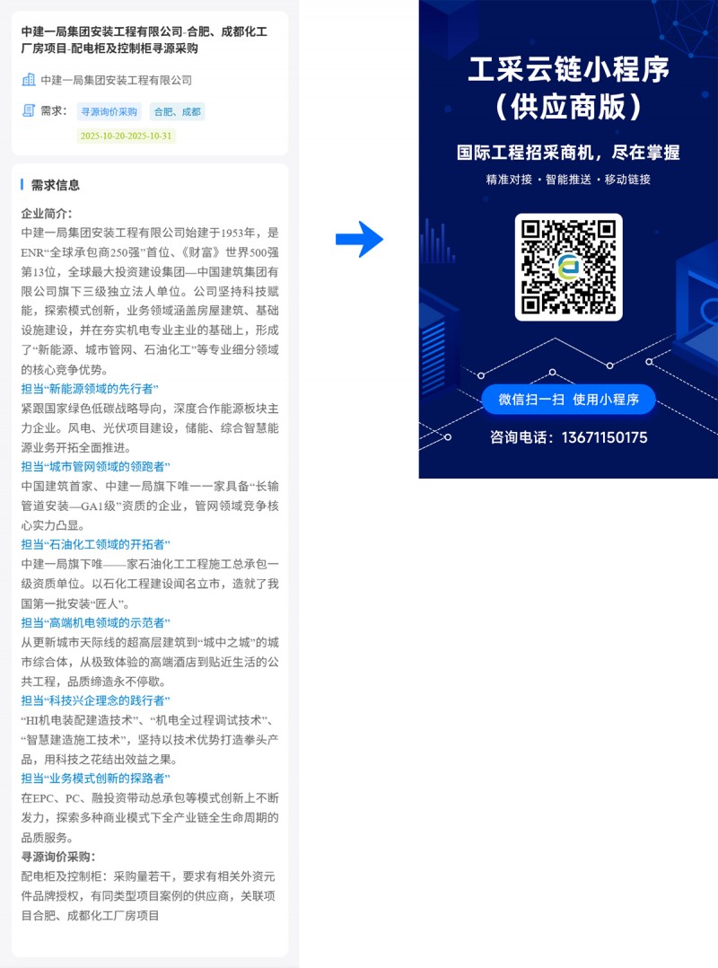 核心提示:中建一局集团安装工程有限公司-合肥、成都化工厂房项目-配电柜及控制柜寻源采购
