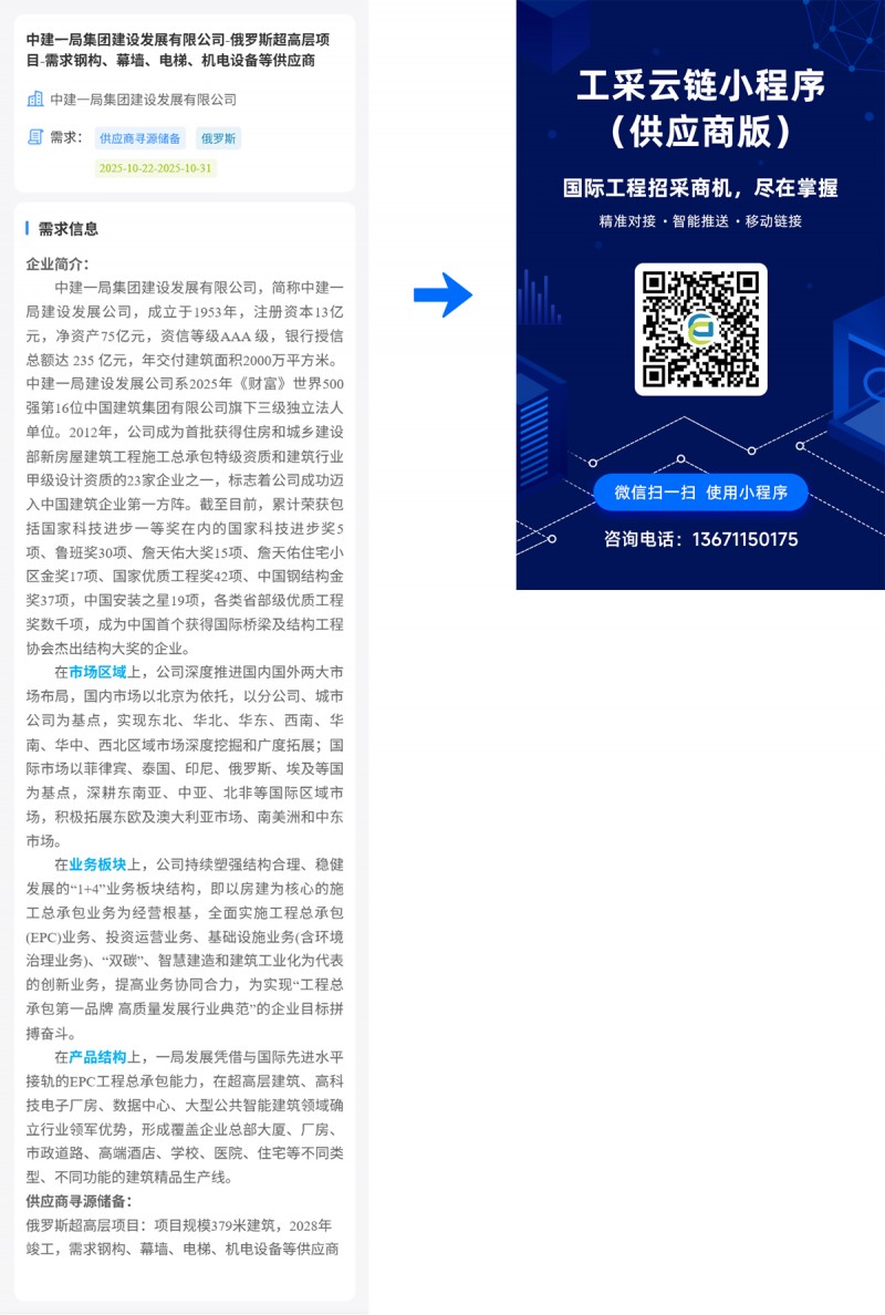 核心提示:中建一局集团建设发展有限公司-俄罗斯超高层项目-需求钢构、幕墙、电梯、机电设备等供应商