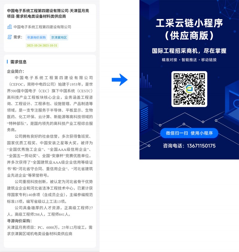 核心提示:中国电子系统工程第四建设有限公司-天津蓝月亮项目-需求机电类设备材料类供应商
