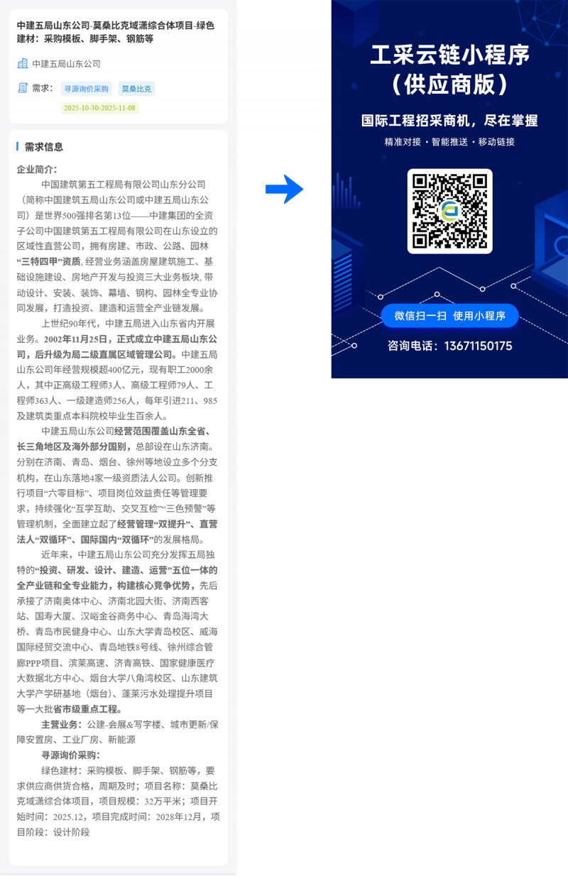 核心提示:中建五局山东公司-莫桑比克域潇综合体项目-绿色建材:采购模板、脚手架、钢筋等