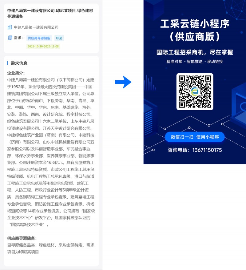 核心提示:中建八局第一建设有限公司-印尼某项目-绿色建材寻源储备