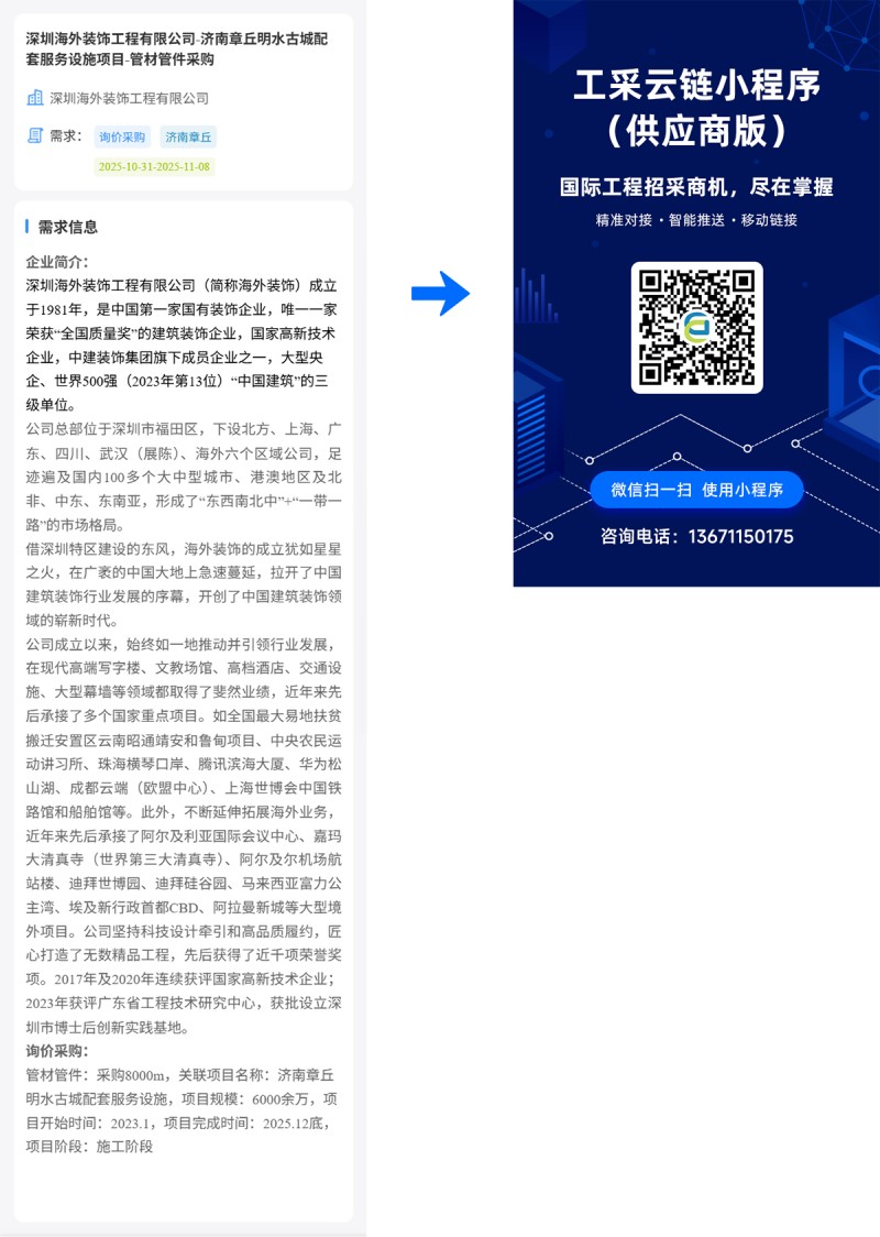 核心提示:深圳海外装饰工程有限公司-济南章丘明水古城配套服务设施项目-管材管件采购