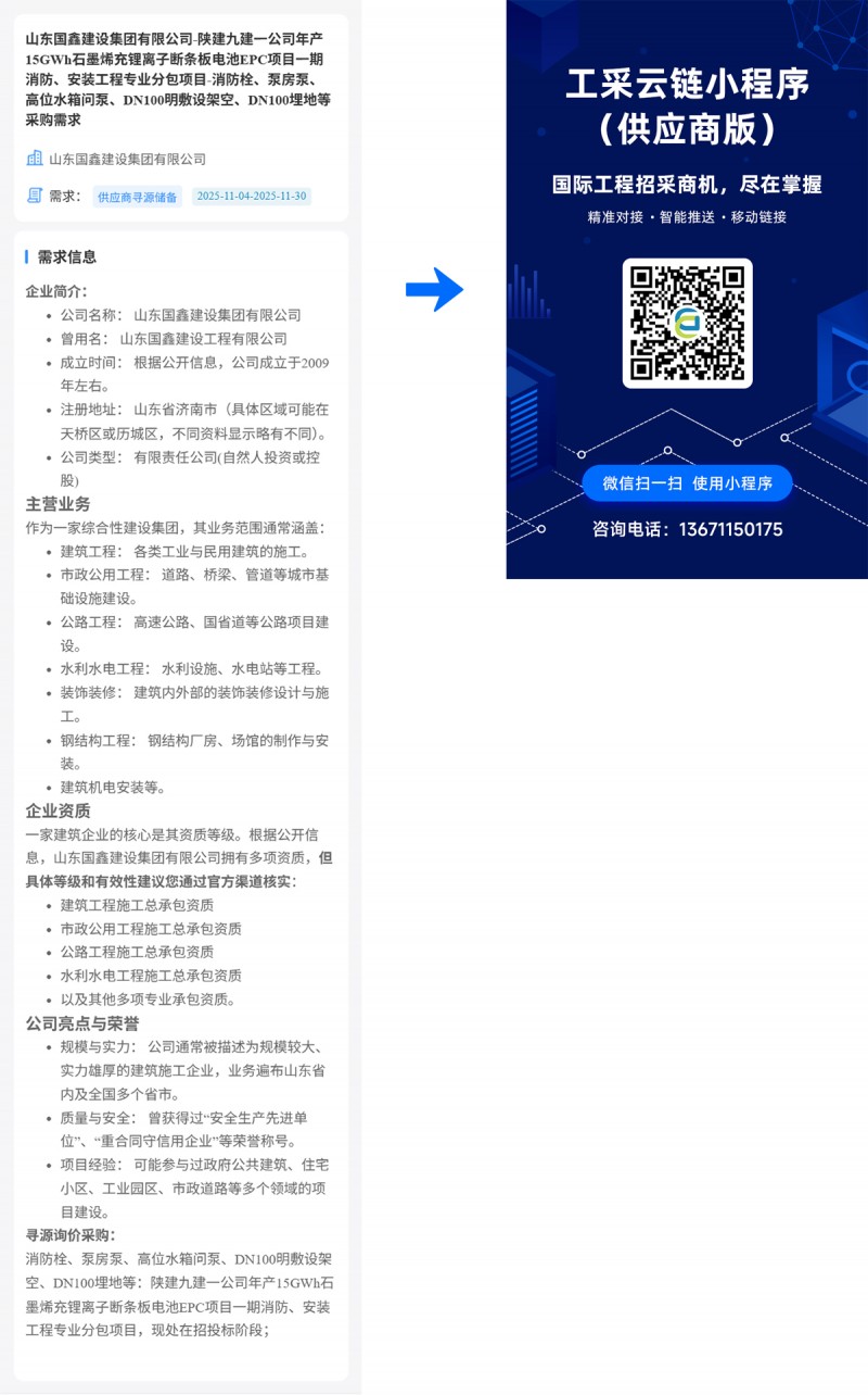 核心提示:山东国鑫建设集团有限公司-陕建九建一公司年产15GWh石墨烯充锂离子断条板电池EPC项目一期消防、安装工程专业分包项目-消防栓、泵房泵、高位水箱问泵、DN100明敷设架空、DN100埋地等采购需求