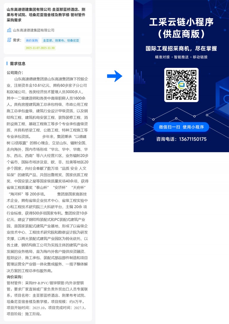核心提示:山东高速德建集团有限公司-圭亚那蓝桥酒店、刚果布考试院、坦桑尼亚宿舍楼及教学楼-管材管件采购需求