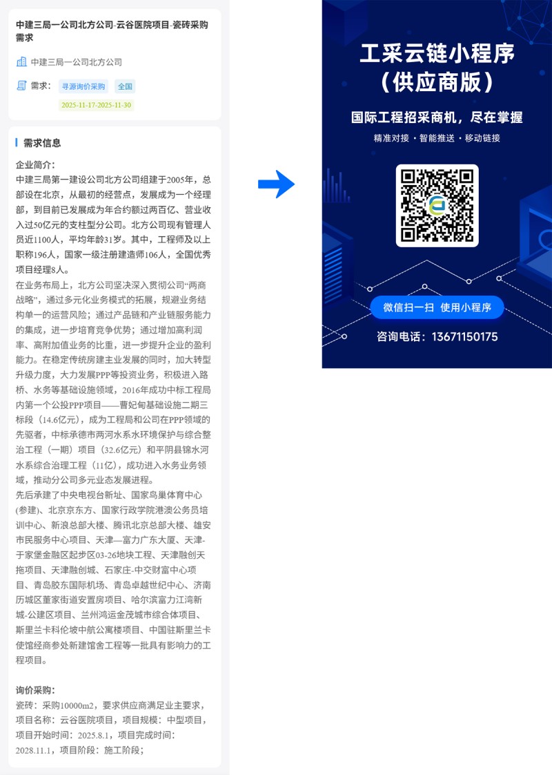 核心提示:中建三局一公司北方公司-云谷医院项目-瓷砖采购需求