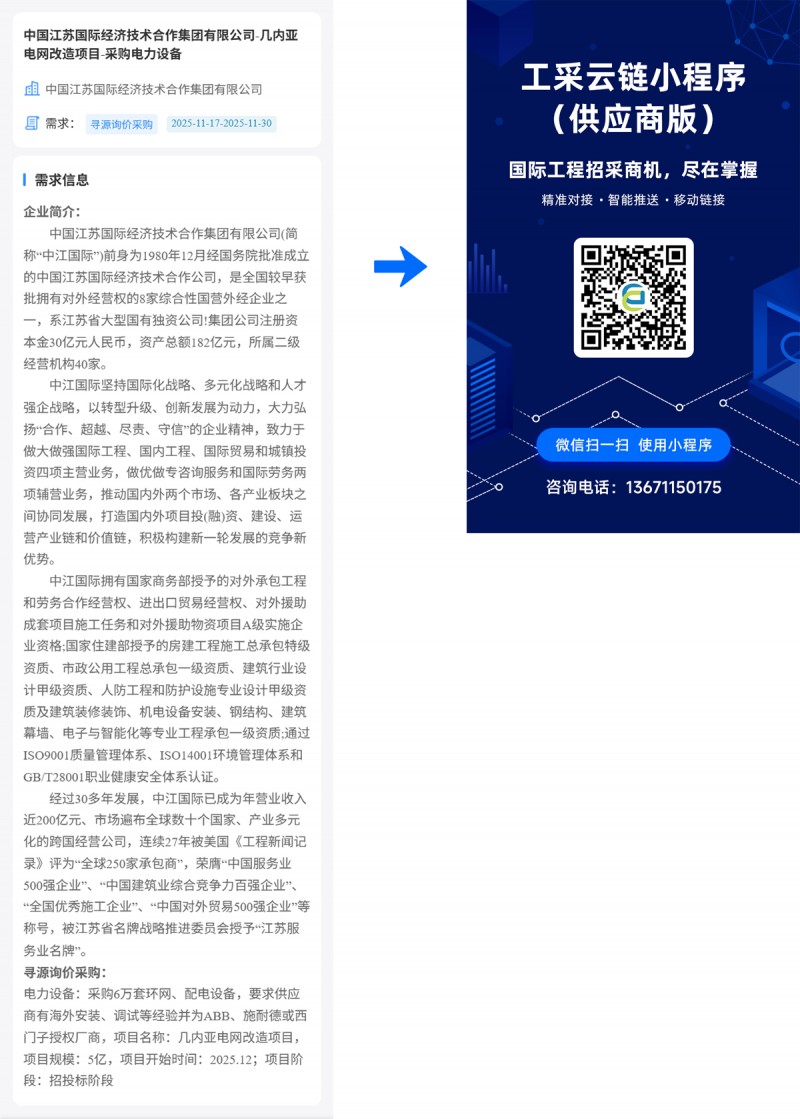 核心提示:中国江苏国际经济技术合作集团有限公司-几内亚电网改造项目-采购电力设备