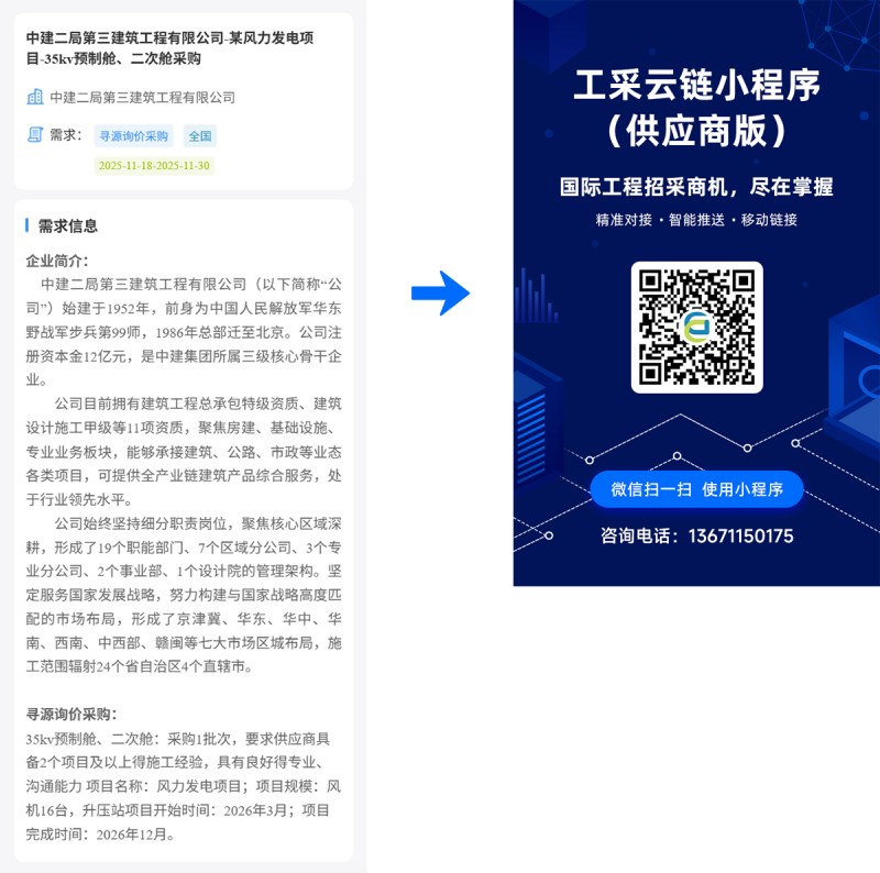 核心提示:中建二局第三建筑工程有限公司-某风力发电项目-35kv预制舱、二次舱采购