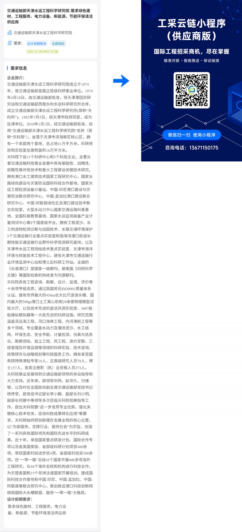 核心提示:交通运输部天津水运工程科学研究院-需求绿色建材、工程服务、电力设备、新能源、节能环保清洁供应商