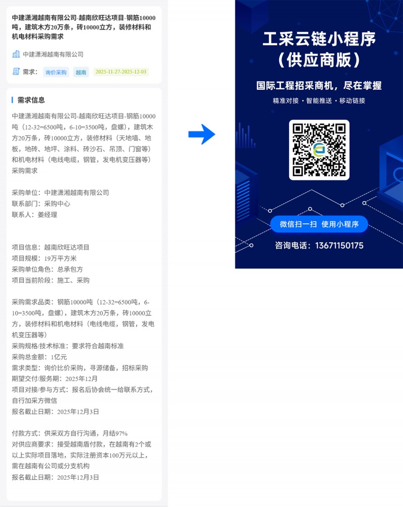 核心提示:中建潇湘越南有限公司-越南欣旺达项目-钢筋10000吨,建筑木方20万条,砖10000立方,装修材料和机电材料采购需求