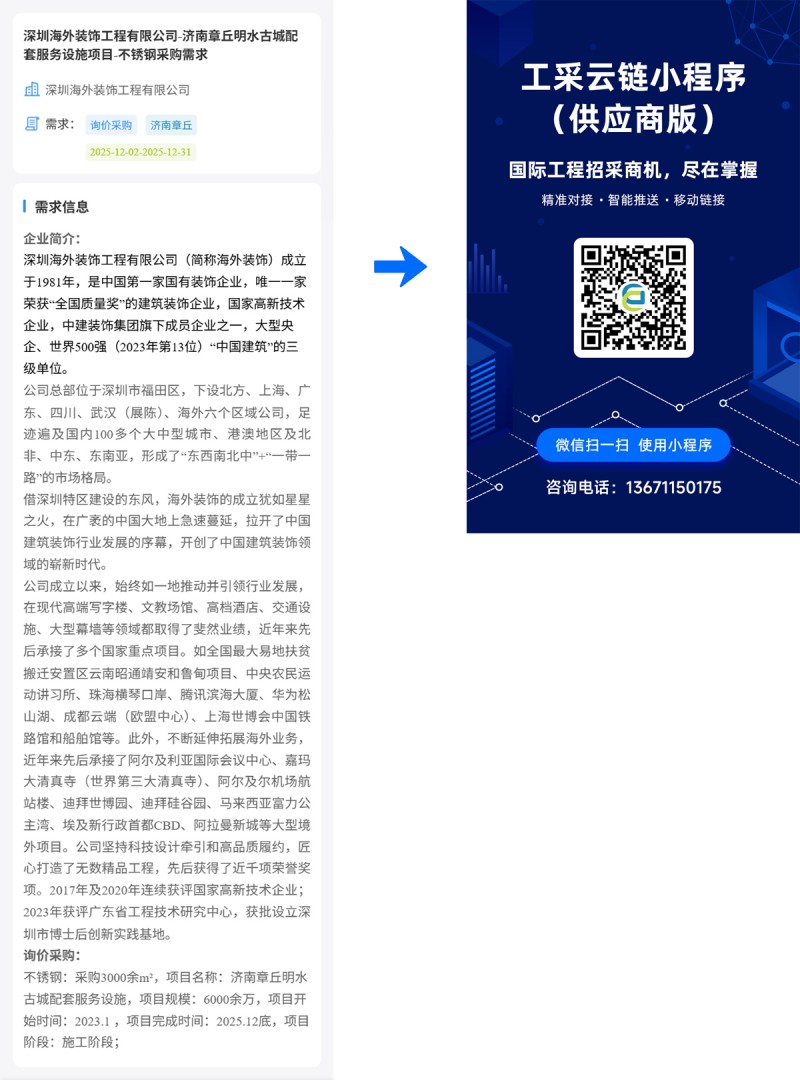 深圳海外装饰工程有限公司-济南章丘明水古城配套服务设施项目-不锈钢采购需求