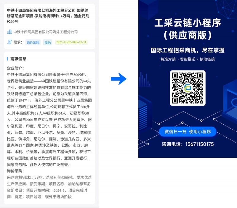 核心提示:中铁十四局集团有限公司海外工程分公司-加纳纳穆蒂尼金矿项目-采购磨机钢球1.4万吨,选金药剂9200吨