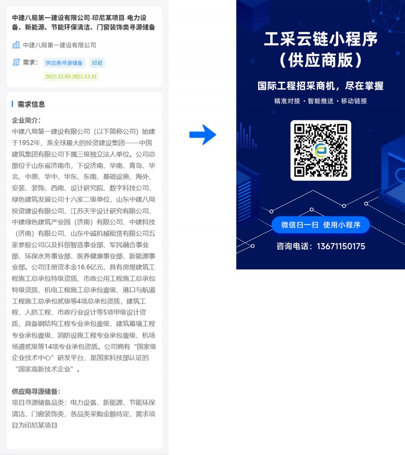 核心提示:中建八局第一建设有限公司-印尼某项目-电力设备、新能源、节能环保清洁、门窗装饰类寻源储备