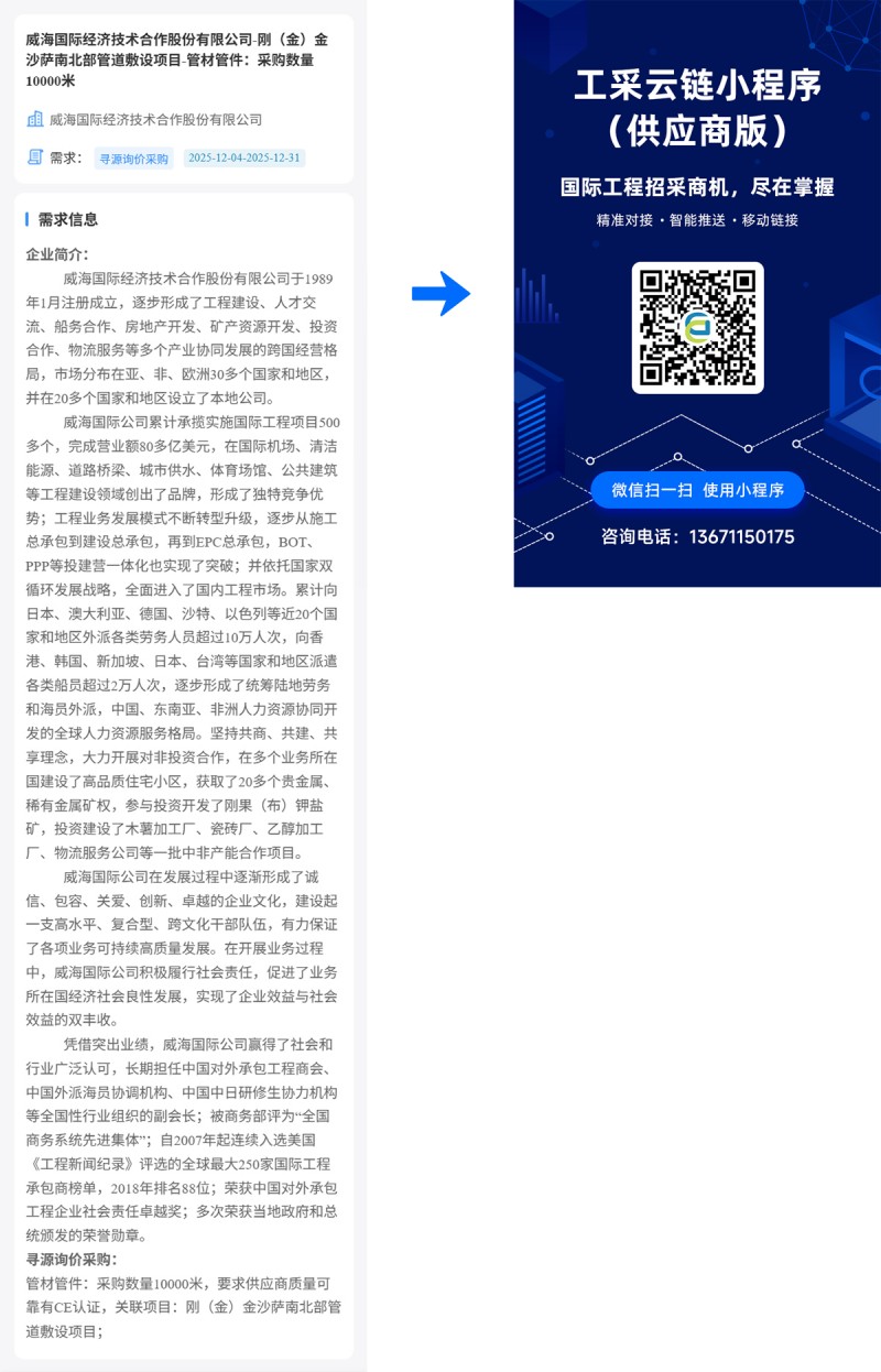 核心提示:威海国际经济技术合作股份有限公司-刚(金)金沙萨南北部管道敷设项目-管材管件:采购数量10000米