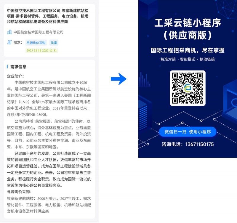 核心提示:中国航空技术国际工程有限公司-埃塞新建航站楼项目-需求管材管件、工程服务、电力设备、机场和航站楼配套机电设备及材料供应商