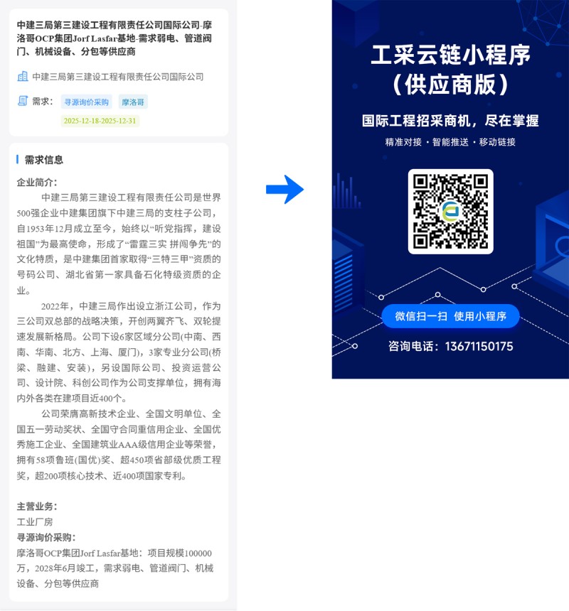 核心提示:中建三局第三建设工程有限责任公司国际公司-摩洛哥OCP集团JorfLasfar基地-需求弱电、管道阀门、机械设备、分包等供应商