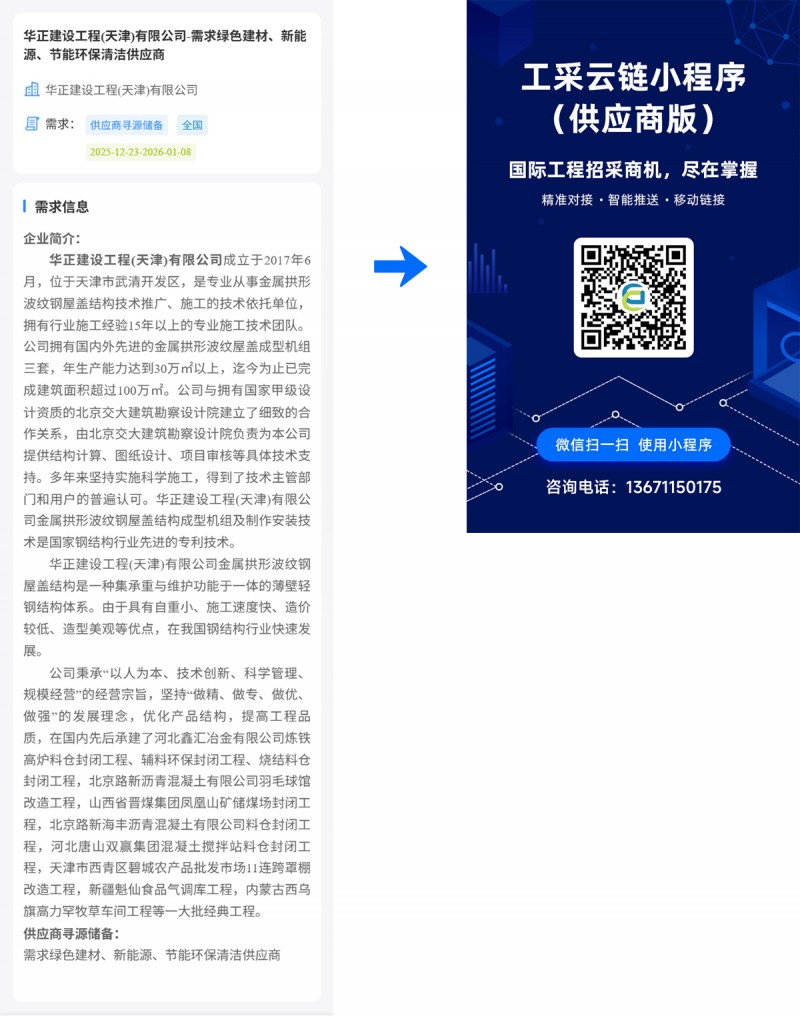 核心提示:华正建设工程(天津)有限公司-需求绿色建材、新能源、节能环保清洁供应商