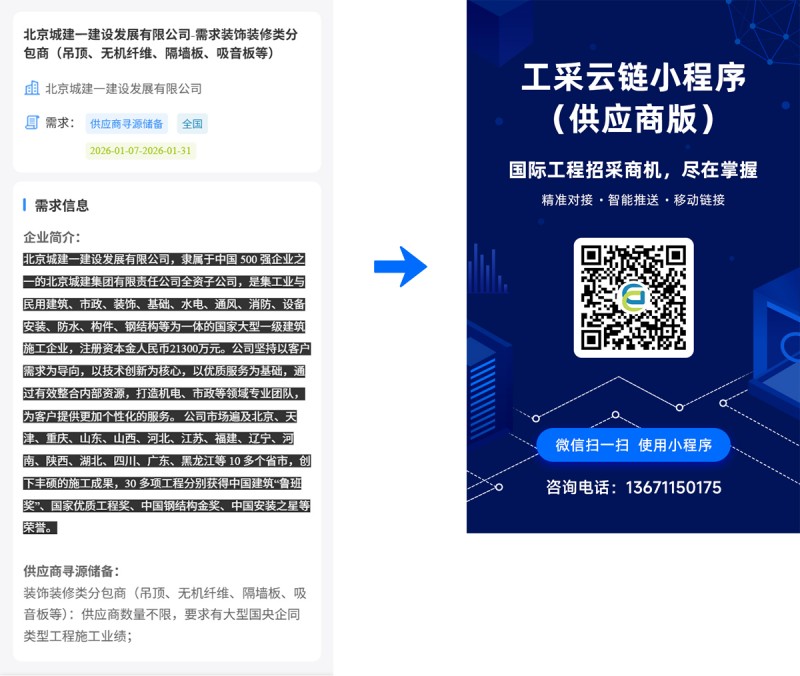 核心提示:北京城建一建设发展有限公司-需求装饰装修类分包商(吊顶、无机纤维、隔墙板、吸音板等)