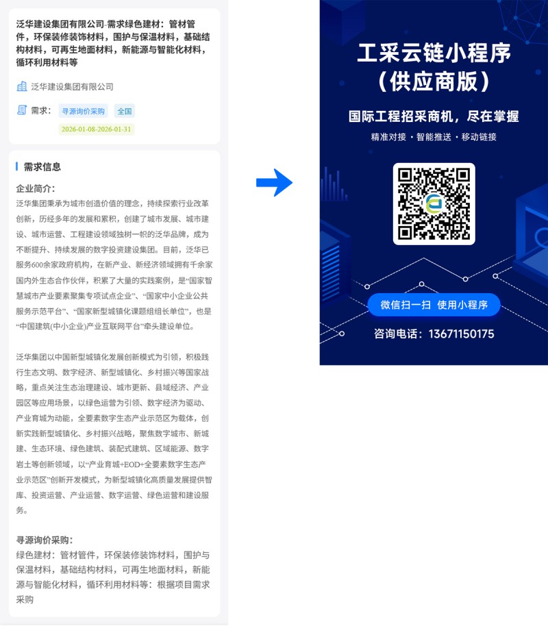 核心提示:泛华建设集团有限公司-需求绿色建材:管材管件,环保装修装饰材料,围护与保温材料,基础结构材料,可再生地面材料,新能源与智能化材料,循环利用材料等