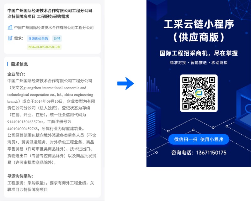核心提示:中国广州国际经济技术合作有限公司工程分公司、沙特保障房项目-工程服务采购需求
