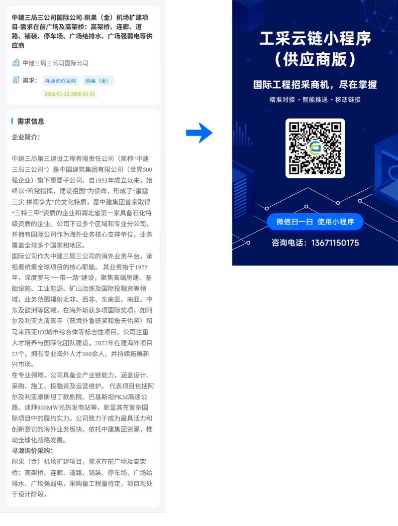 核心提示:中建三局三公司国际公司-刚果(金)机场扩建项目-需求在前广场及高架桥:高架桥、连廊、道路、铺装、停车场、广场给排水、广场强弱电等供应商