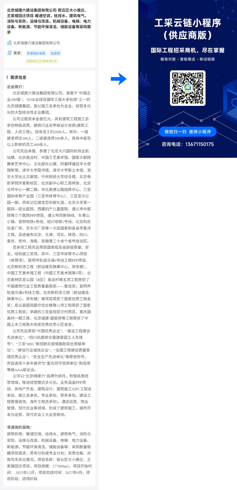 核心提示:北京城建六建设集团有限公司-密云区大小唐庄、王家楼回迁项目-暖通空调,给排水,建筑电气,消防与安防,运维与改造,机械设备、电梯、电力设备、新能源、节能环保清洁、储能设备等采购需求