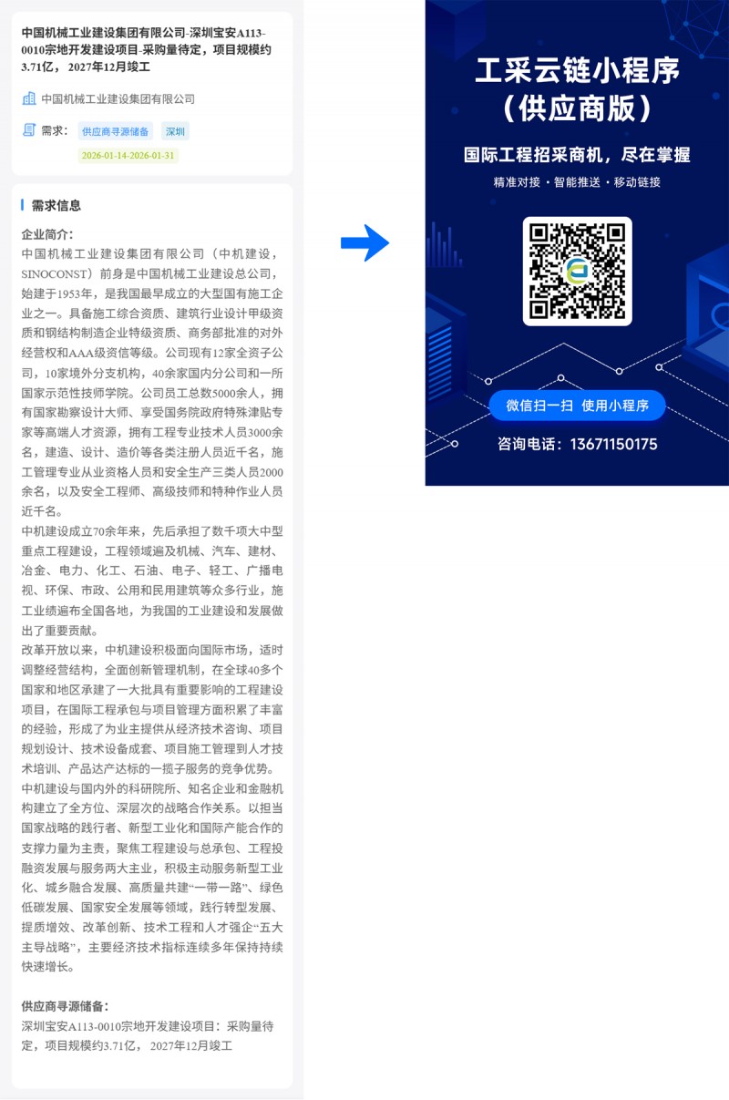 核心提示:中国机械工业建设集团有限公司-深圳宝安A1130010宗地开发建设项目-采购量待定,项目规模约3.71亿,2027年12月竣工
