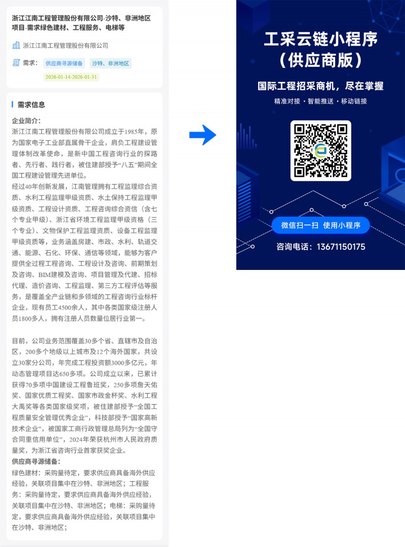 核心提示:浙江江南工程管理股份有限公司-沙特、非洲地区项目-需求绿色建材、工程服务、电梯等