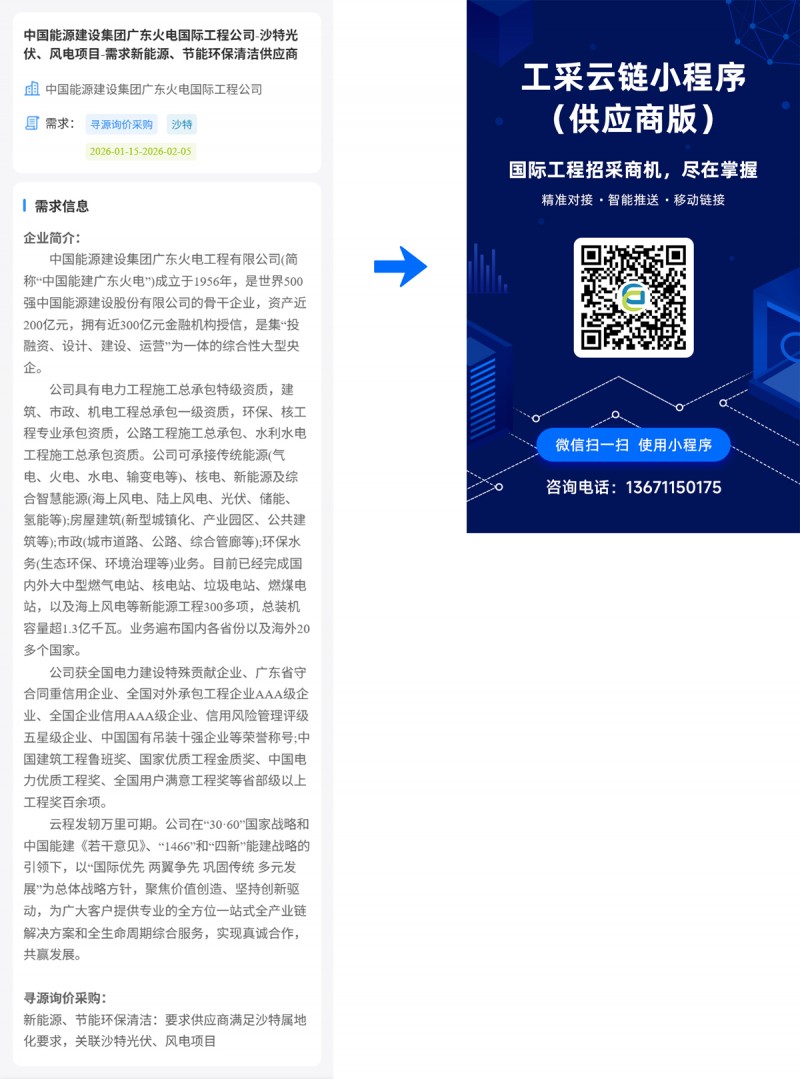 核心提示:中国能源建设集团广东火电国际工程公司-沙特光伏、风电项目-需求新能源、节能环保清洁供应商
