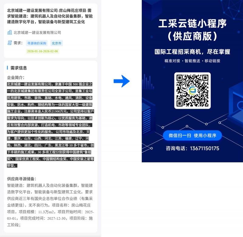 核心提示:北京城建一建设发展有限公司-房山梅花庄项目-需求智能建造:建筑机器人及自动化装备集群,智能建造数字化平台,智能装备与新型建筑工业化