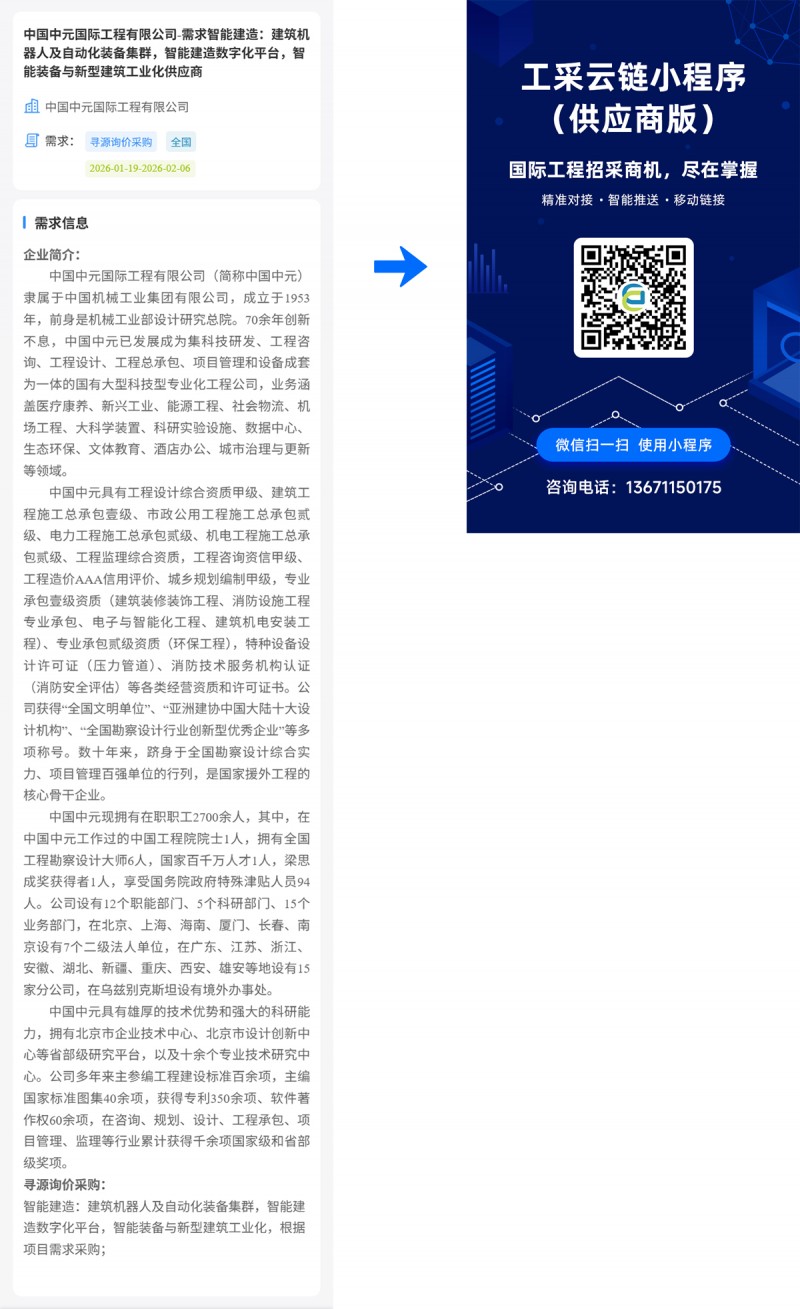 核心提示:中国中元国际工程有限公司-需求智能建造:建筑机器人及自动化装备集群,智能建造数字化平台,智能装备与新型建筑工业化供应商