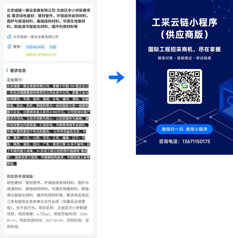 核心提示:北京城建一建设发展有限公司-文旅区中小学新建项目-需求绿色建材:管材管件,环保装修装饰材料,围护与保温材料,基础结构材料,可再生地面材料,新能源与智能化材料,循环利用材料等