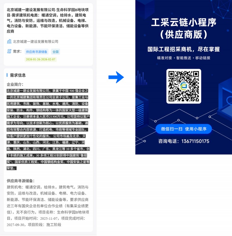 核心提示:北京城建一建设发展有限公司-生命科学园B地块项目-需求建筑机电类:暖通空调,给排水,建筑电气,消防与安防,运维与改造,机械设备、电梯、电力设备、新能源、节能环保清洁、储能设备等供应商