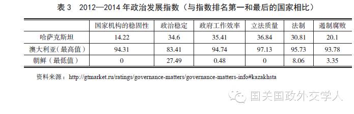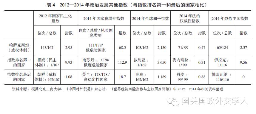 属于威权体制的国家,但是国家脆弱性指数显示,哈萨克斯坦属于低危险性的国家(111/178),显示了亚洲地区民主化与政治文化传统的特殊性。