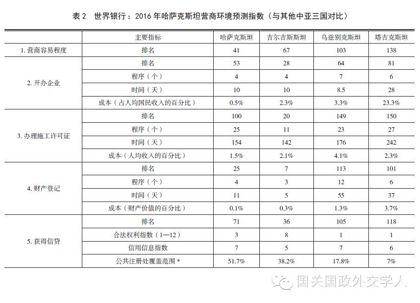 在世界银行公布的《2016年营商环境预测报告DoingBusiness2016》中,哈萨克斯坦名列第41位,较前一年上升12位。世界银行对哈萨克斯坦与其他中亚三国2016年营商环境预测指数进行对比(详见表2)发现