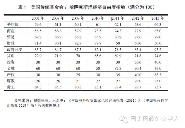 美国传统基金会和《华尔街日报》每年公布的全球“经济自由度报告”,世界银行发布的年度营商环境指数表明,2007—2015年哈萨克斯坦的经济环境总体向好,经济自由度指数从2007年以来呈现出逐步提高的趋势(见表1)在世界经济论坛发布的《2015—2016年全球竞争力报告》中,哈萨克斯坦名列第42位,较前一年上升8位,创下历史新高。