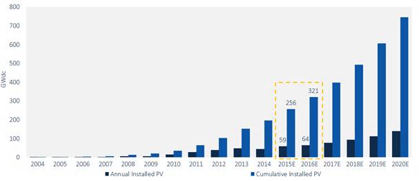 2015年全球新增光伏装机容量较2014年增加了34%,达到约59GW,全球累计装机容量256GW。